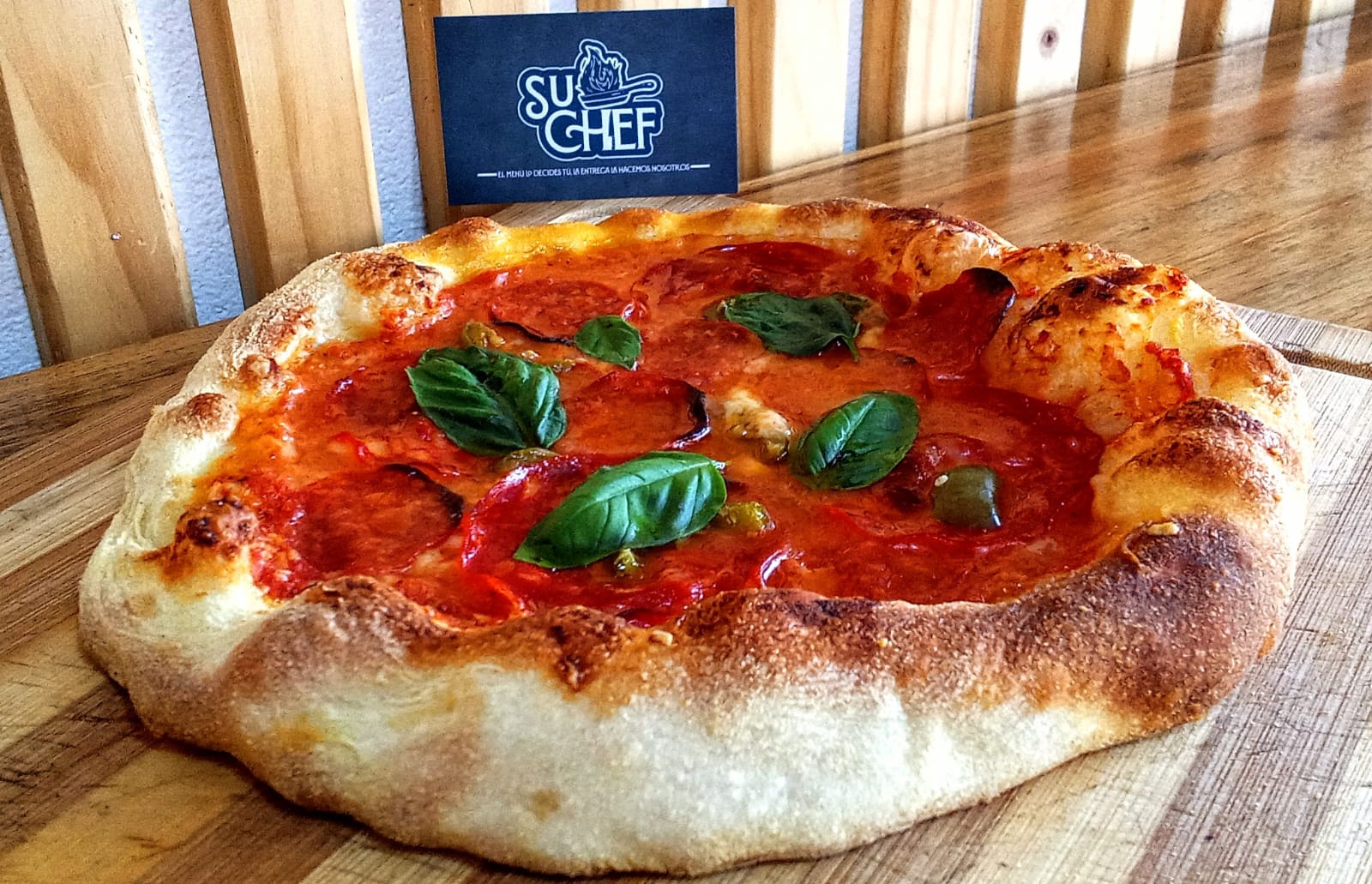 Chorizo curado. pepperoni picante. jalapeños frescos. albahaca fresco. mozzarella, salsa de tomate