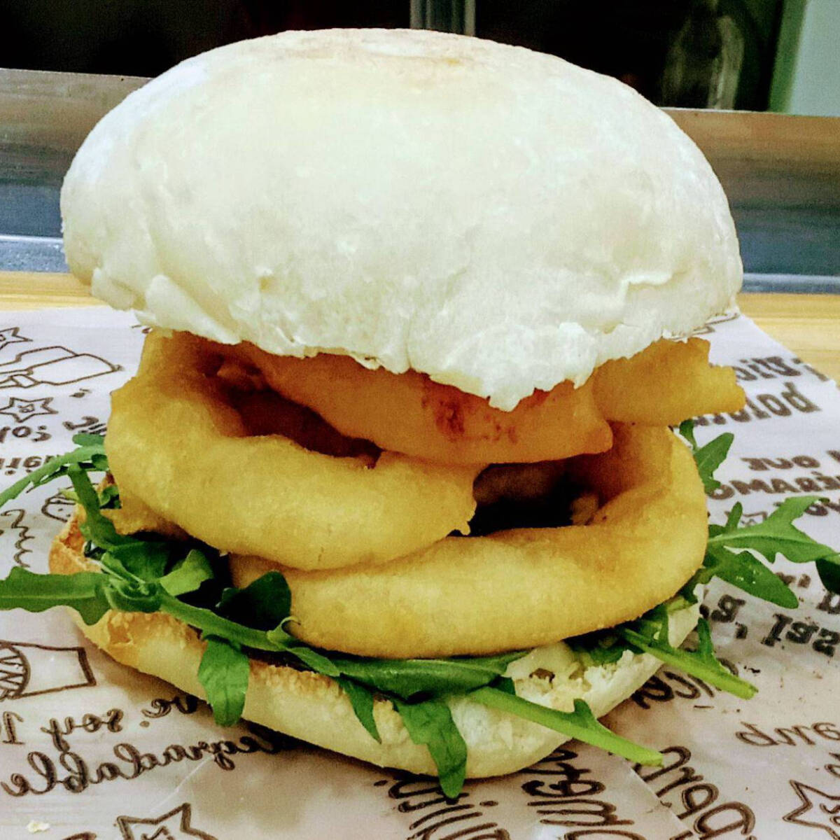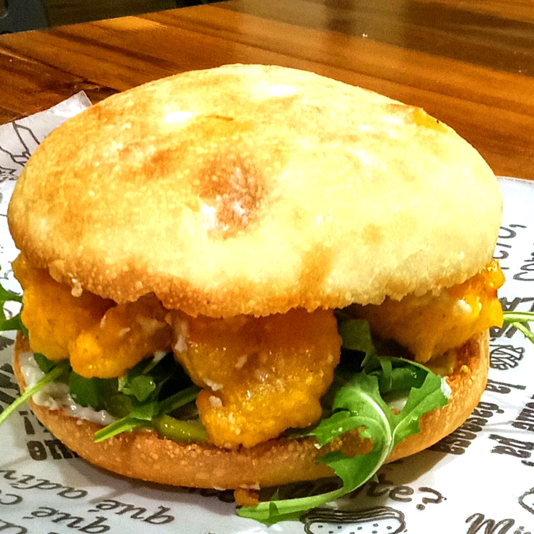 Pan Focaccia casera relleno de camarines aborrajados en masa de cerveza, salsa alioli, servido con papas rusticas y salsa