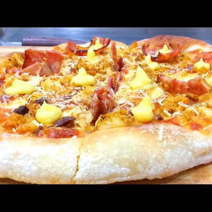 crema de platano maduro, pollo ahumado al barril, tocineta. mozzarella. salsa de tomate