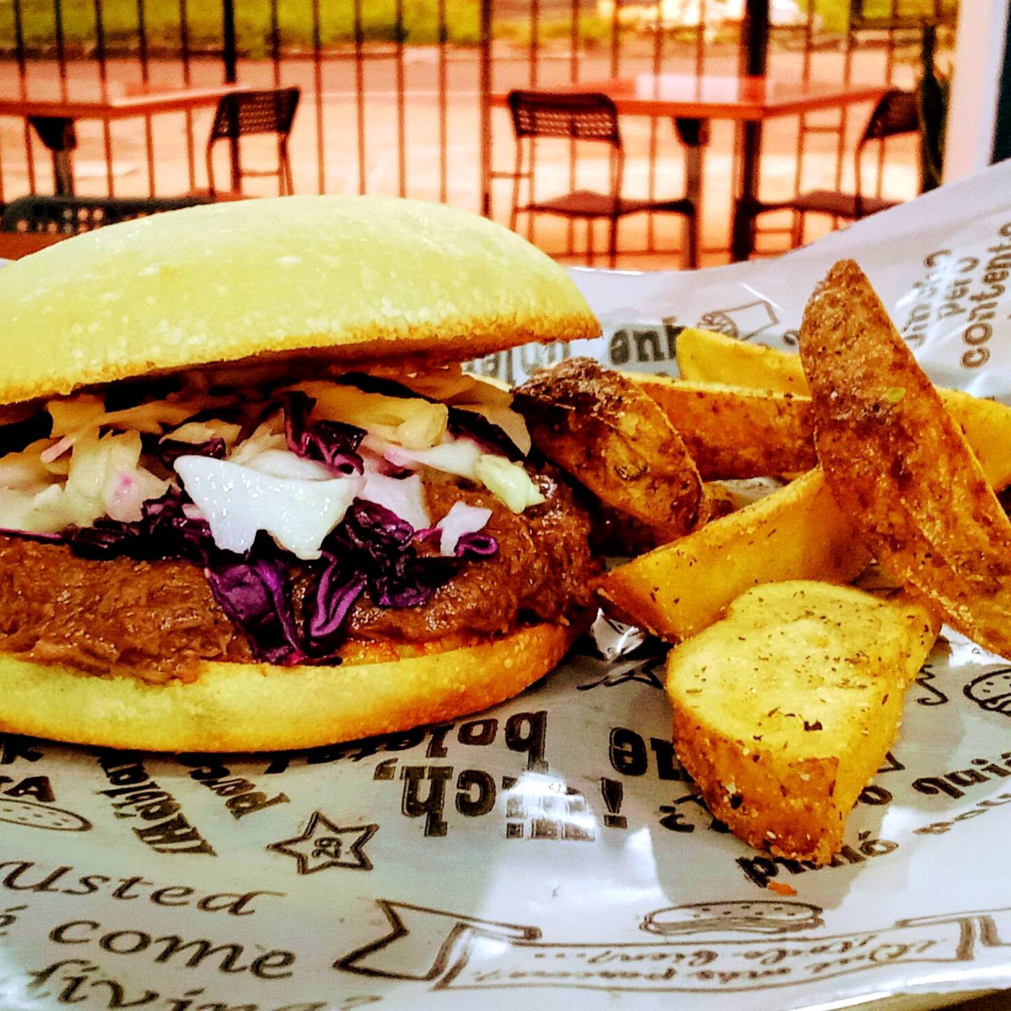 pan focaccia casera con pecho de res ahumado al barril, salsa de bbq casera, queso fundido, servido con papa rusticas y salsa