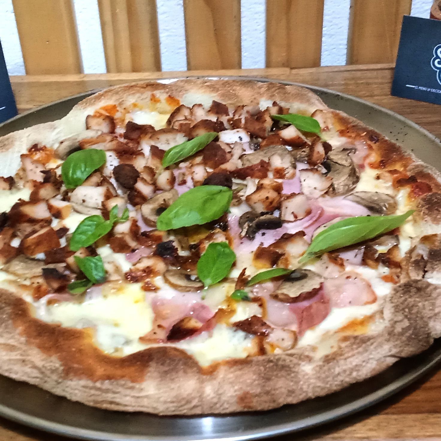 Pollo ahumado al barril. champiñones frescas. hoja de albahaca. mozzarella. salsa de tomate