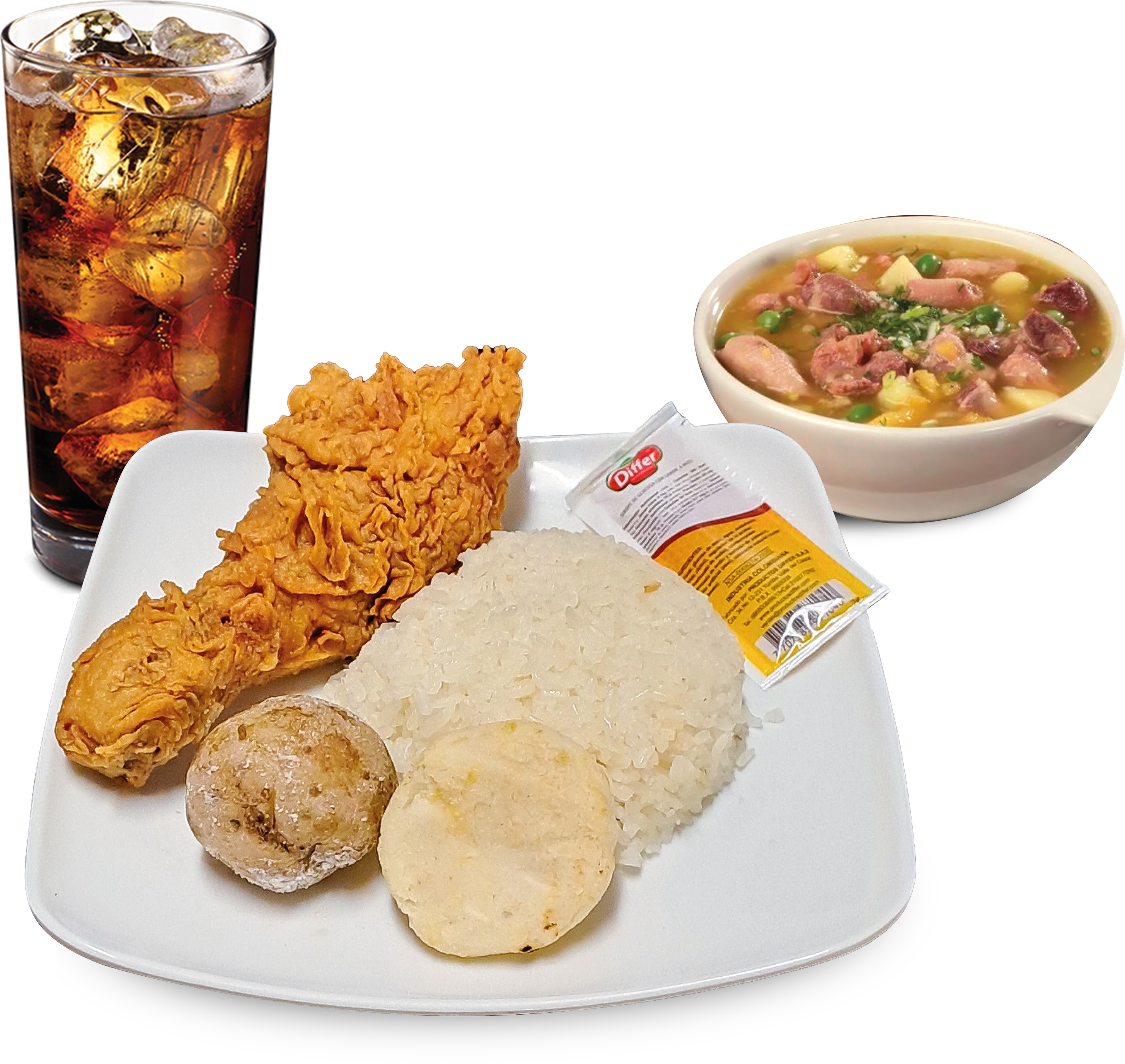 Incluye: 1 presa de pollo apanado, 1 porción de arroz, 1 papa hervida, 1 arepa, 1 sachet de salsa, y 1 gaseosa (250 ml).