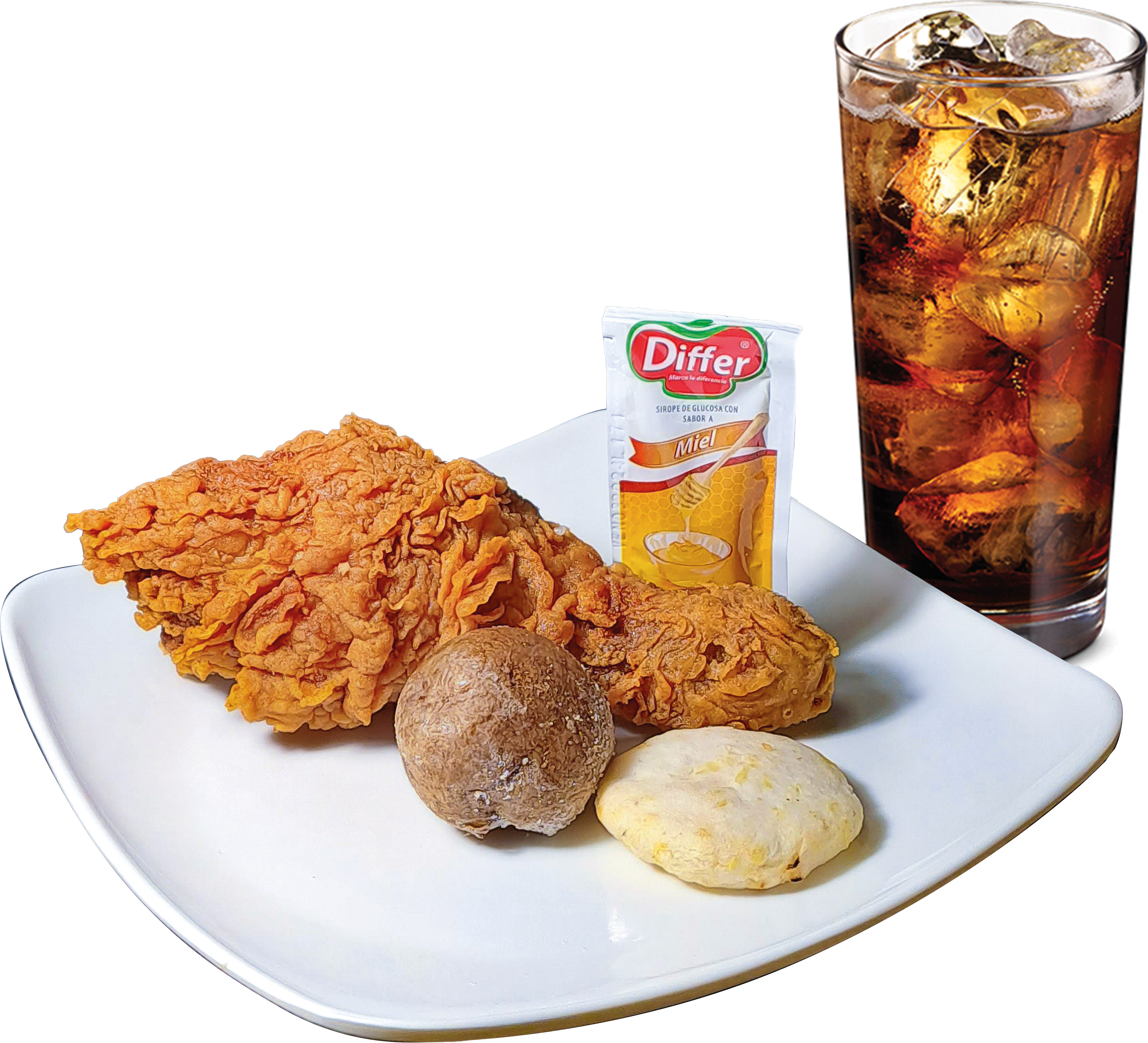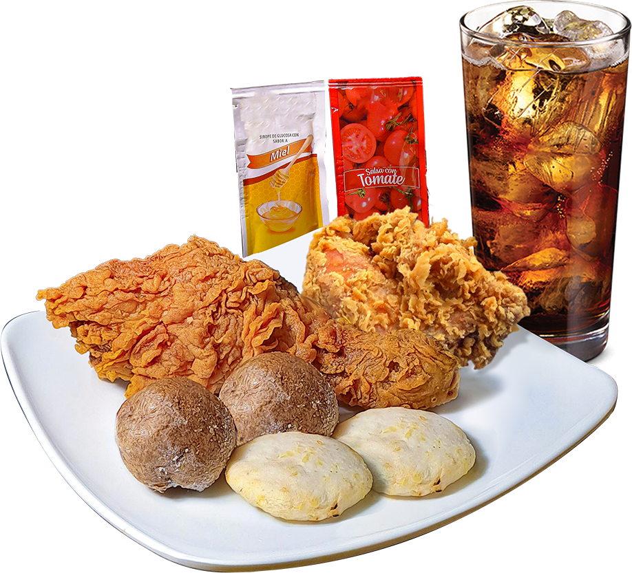 Incluye: 1 presa de pollo apanado, 1 papa hervida, 1 arepa, 1 sachet de salsa, y 1 gaseosa (250 ml).