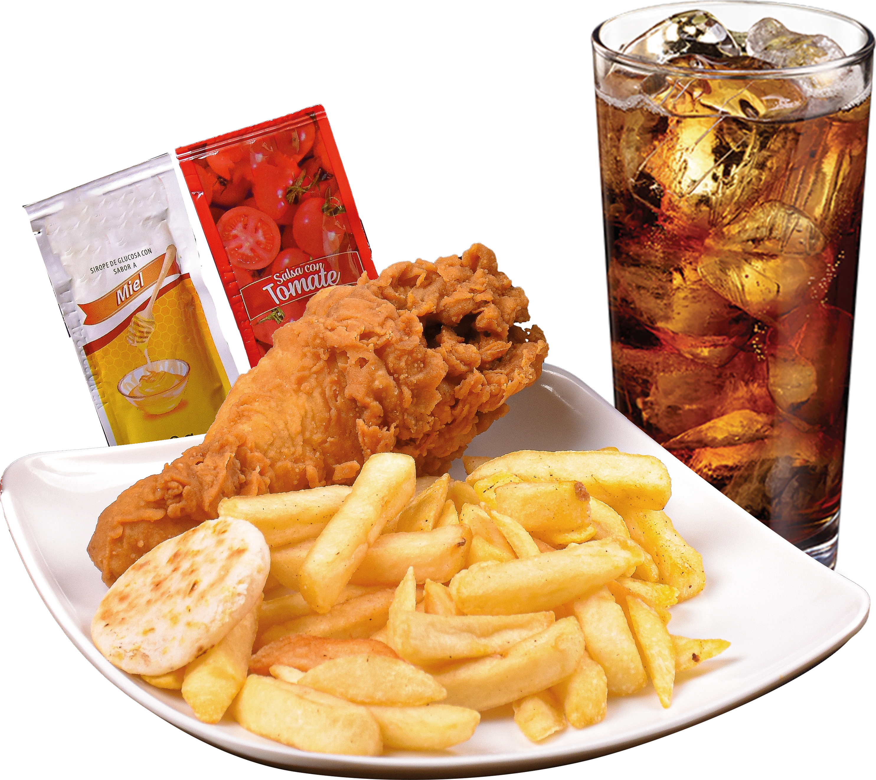 Incluye: 1 presa de pollo apanado, 1 porción de papas a la francesa, 1 arepa, 2 sachets de salsa, y 1 gaseosa 250 ml