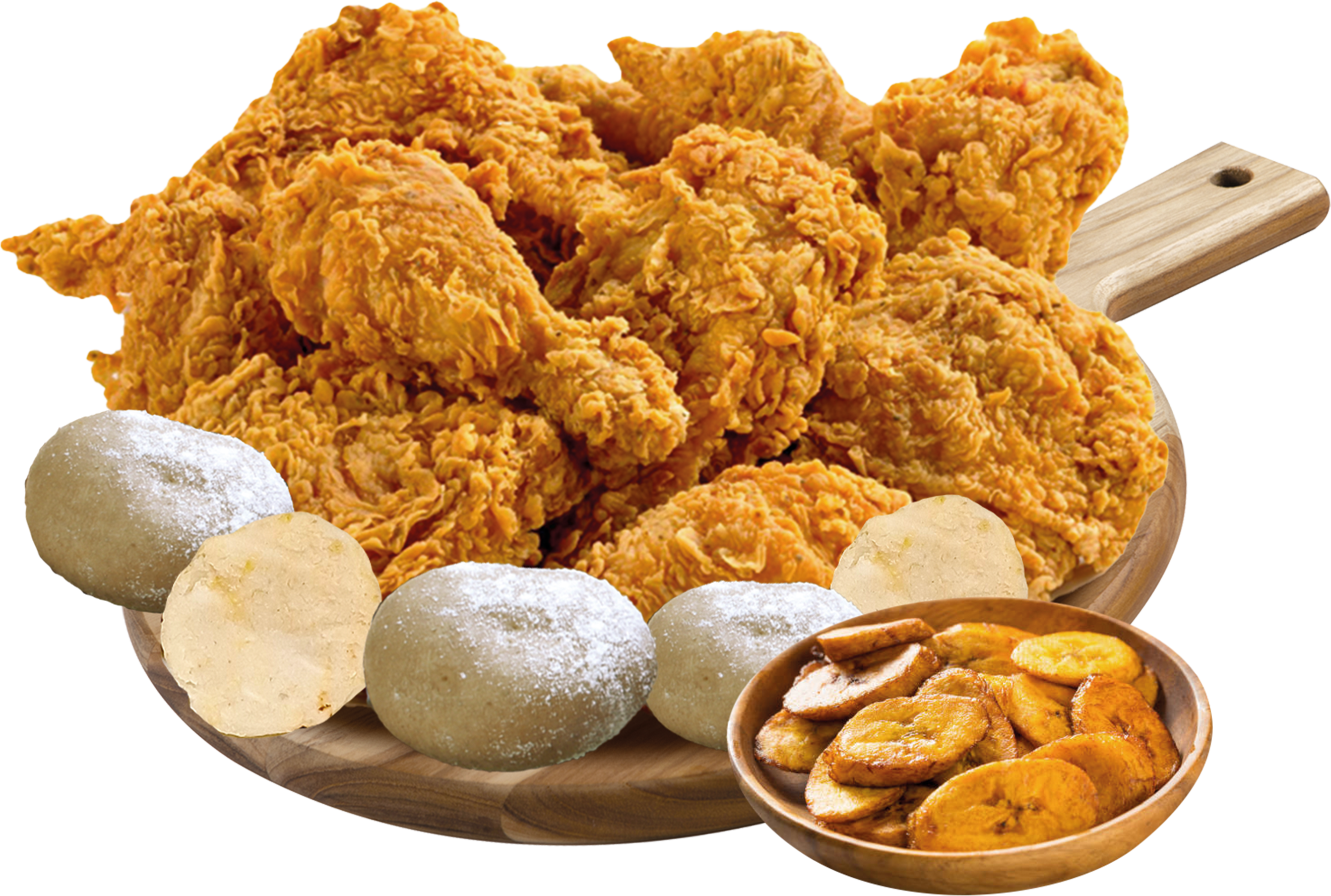 Platillo personal ,2 presas de pollo apanado (a elección) con 2 arepas y papa 2 sachets de salsa (1 tomate y 1 miel).