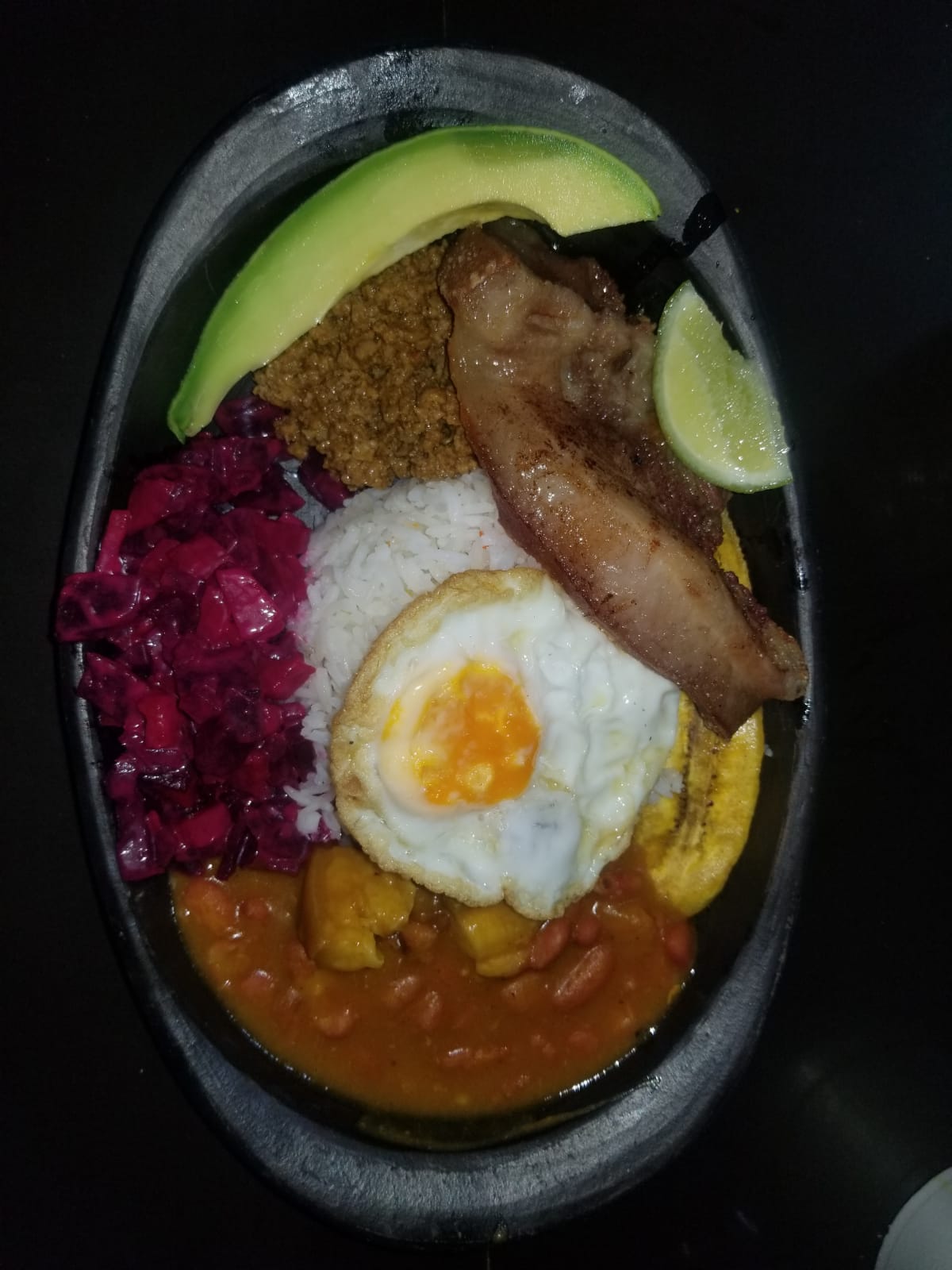 Acompañada con arroz, frijoles, ensalada, carne molida, chicharrón, huevo frito, aguacate, sopa a elección y limonada.