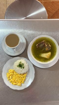 Desayuno completo con caldo de costilla 16 onzas, huevo ( 1 pieza a elección), arroz blanco y bebida a elección de 400 ml a elección.