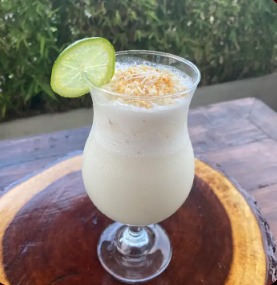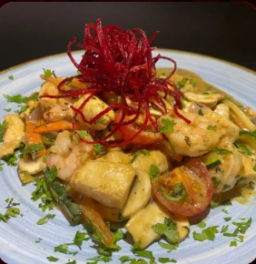 Pollo, camarones, verduras, crema de coco, terminado con un delicioso aroma de albahaca ligeramente picante y acompañado de arroz aromatizado.