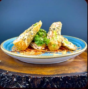 Salmón apanado, queso filadelfia, envuelto con kani, bañado con salsa garden, sobre hilo de arroz frito, por 6.