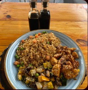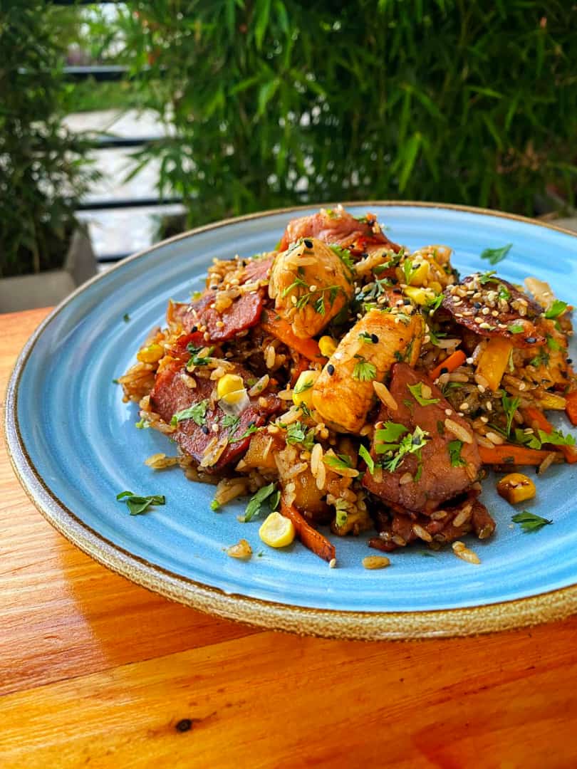 Arroz salteado con cebolla, zukini, pollo, tocineta, maduro, maicitos y teriyaki.