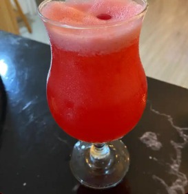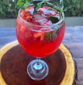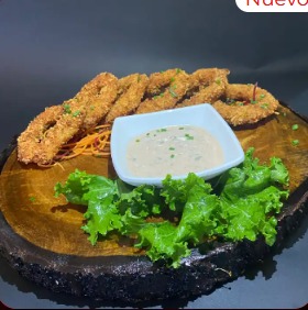 Camarones rebosados en mezcla de salsa roja, mango, cebolla morada, cilantro, acompañado de chips de plátano.