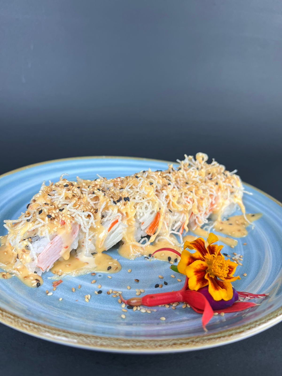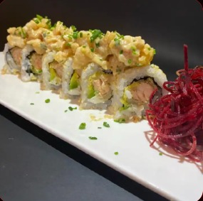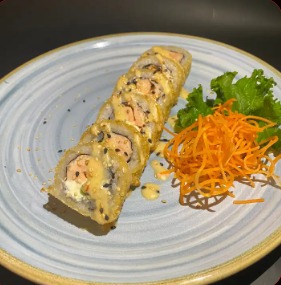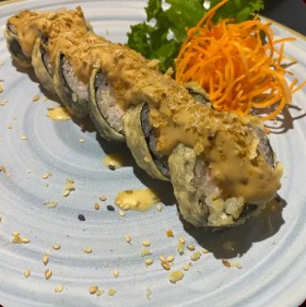 Salmón, atún, kani, aguacate, envuelto con ajonjolí, bañado con salsa dinamita, por 6.