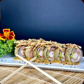 Atún, tocineta, kani, apanado con full salsa de maracuyá, rociado con cebollín, por 6.