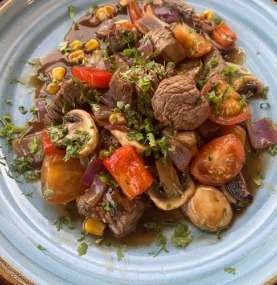 Cubos de lomo viche salteados con pimentón, cebolla morada, champiñón, maicitos, tomate cherry, cilantro a base de soya.