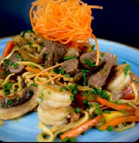 Lomo viche, camarón, con verduras salteadas y pasta noodles, con un ligero sabor a aceite de sésamo y soya.