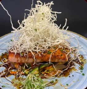 Salmón sellado en salsa thai, con verduras salteadas, acompañado de arroz aromatizado.