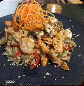 Arroz salteado con langostino, calamar, verduras a base de crema de coco, acompañado de chips de plátano.