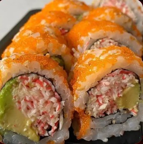 Kani, queso, aguacate, envuelto en masago y ajonjolí, por 6.