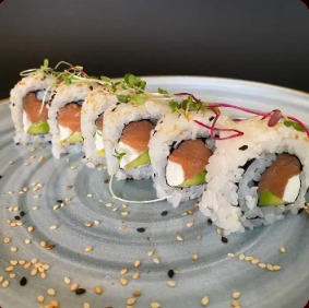 Salmón fresco, aguacate, queso filadelfia, envueltos con semillas de ajonjolí, por 6.