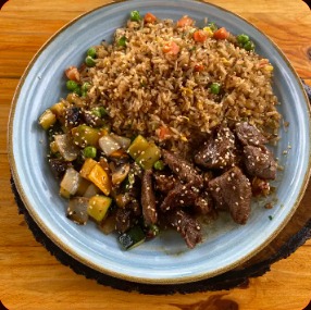 Lomo viche salteado en teriyaki, acompañado de arroz yakimeshi y verduras.