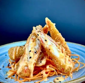 Langostino, aguacate, kani, queso, tempurado con salsa divorcio, por 6.
