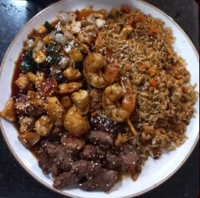 Pollo, lomo viche, langostino en salsa teriyaki, acompañado de arroz teppan y verduras.