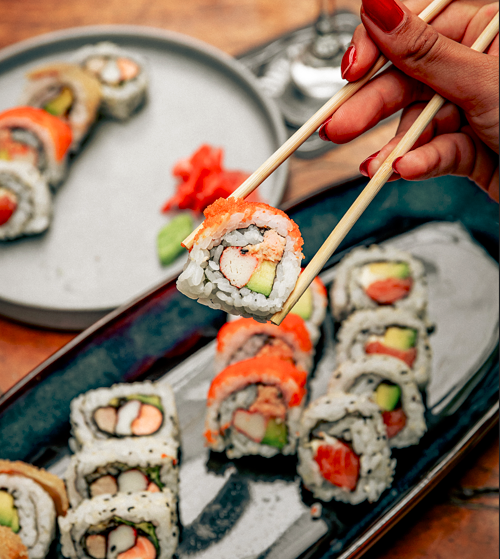 Sushi X5 Bocados. Langostino Tempura, Aguacate y Queso Crema, con Salsa de Ají Amarillo, Pimienta, y Un Toque de Masago.