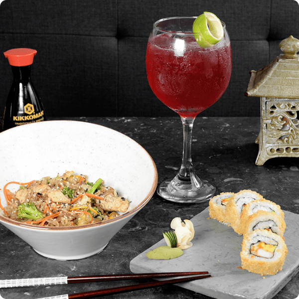 Sushi Ceviche Roll X5 Bocados, Acompañado con Arroz Al Wok con Vegetales, Madurito, Maní y Pollo.