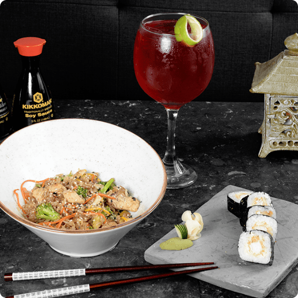 Sushi California Especial X5 Bocados, Acompañado con Arroz Al Wok con Vegetales, Madurito, Maní y Pollo.