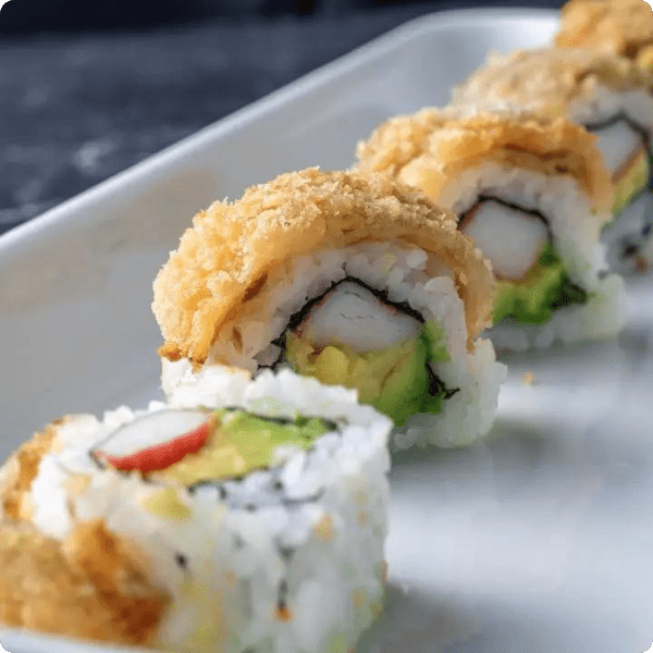 Sushi X5 Bocados. Kani, Aguacate, Salmón Tempurado en Panko y Salsa de Chile Dulce.