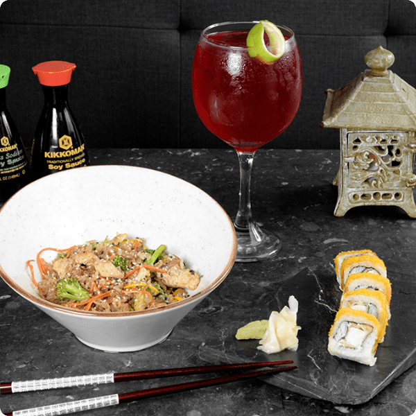 Sushi Madurito X5 Bocados, Acompañado con Arroz Al Wok con Vegetales, Madurito, Maní y Pollo.