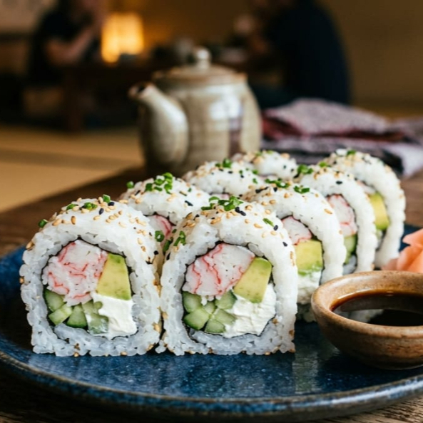 Kanikama, aguacate, pepino, tosago, queso crema.