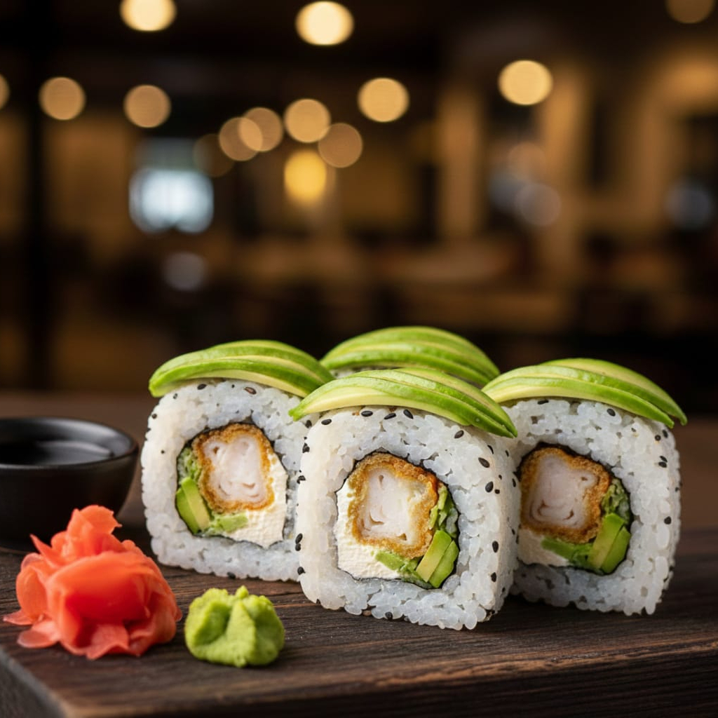 11 Bocados, langostino tempurado al panko con aguacate, queso crema y topping de aguacate.
