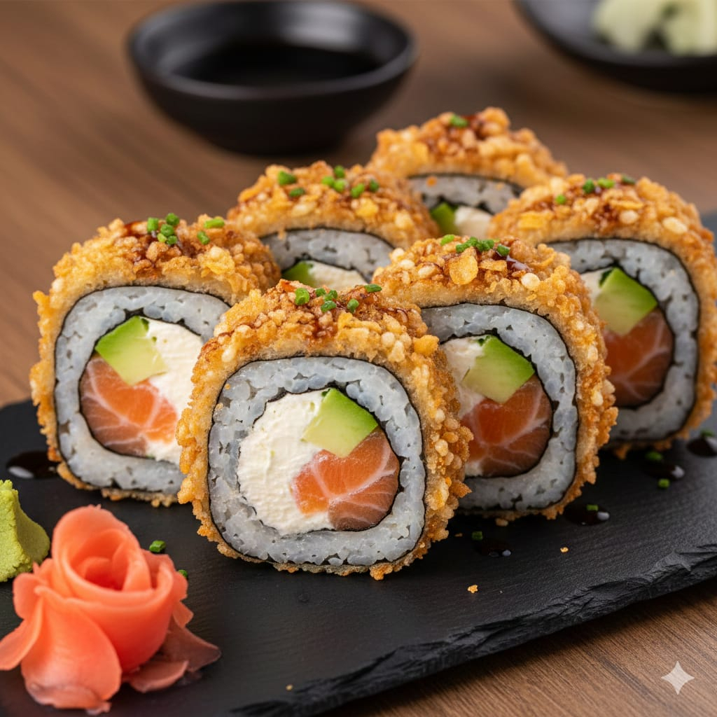 11 Bocados de rollo tempurado al panko con salmón, queso crema, aguacate