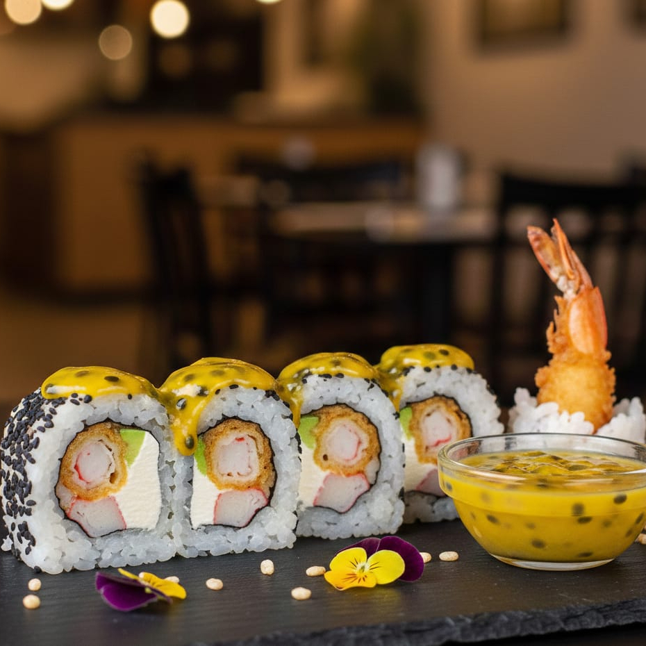 11 Bocados, camarones tempurados al panko con kanikama, aguacate, queso crema, topping de ajonjolí y mix con dip de maracuyá.