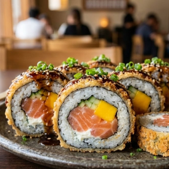 11 Bocados, rollo tempurado al panko con salmón, mango y topping de salsa de anguila.