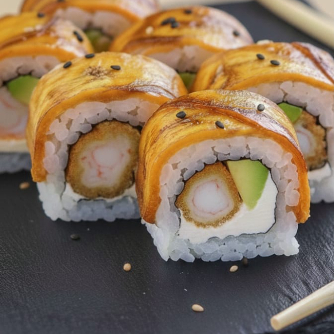11 Bocados, langostino tempurado al panko con aguacate, queso crema, topping de kanikama con salsa de anguila y rollo tempurado al panko.