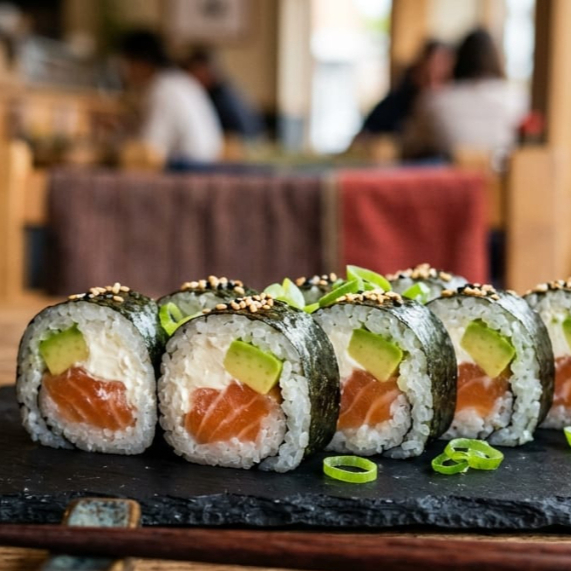 11 Bocados, salmón, aguacate, queso crema y topping de ajonjolí negro.