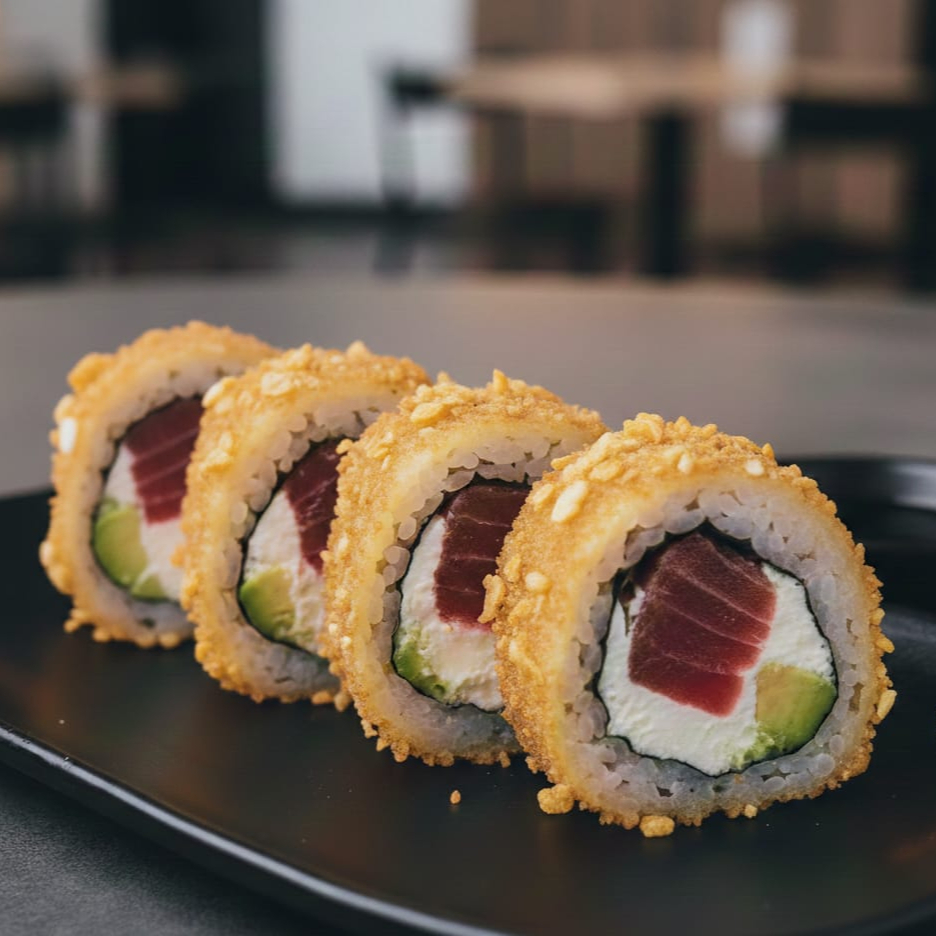 11 Bocados, rollo tempurado al panko con atún oriental, queso crema, aguacate y topping de salsa dinamita.