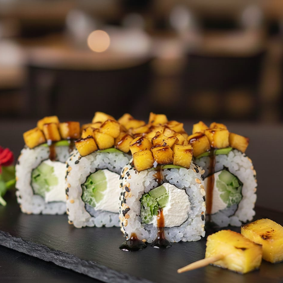 11 Bocados, aguacate, pepino, queso crema, ajonjolí mixto, con un topping de piña asada.