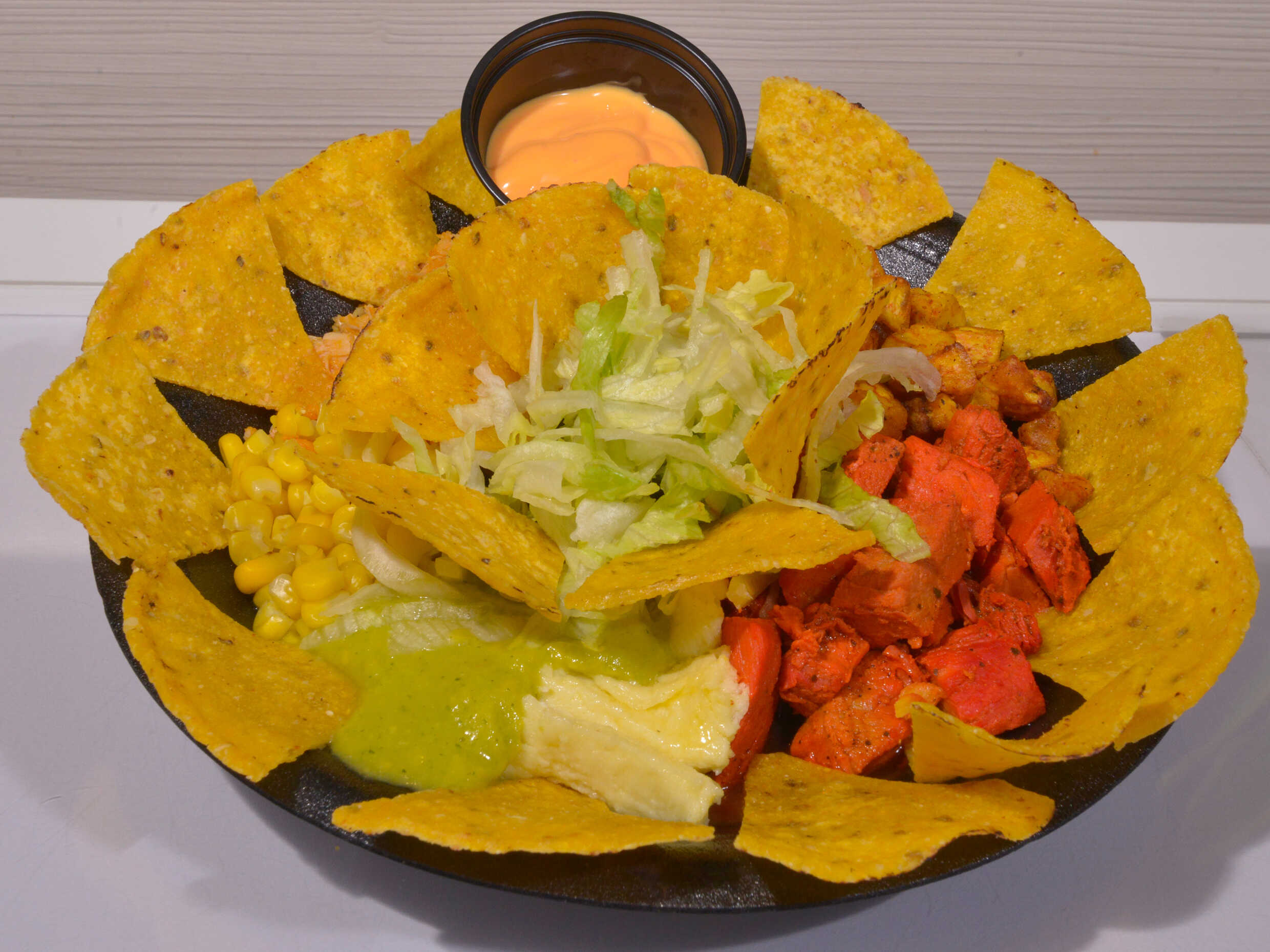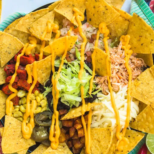 Nachos crocantes, frijol, carne, piña, guacamoles, pico de gallo, maíz, queso, cheddar, maduro y lechuga.