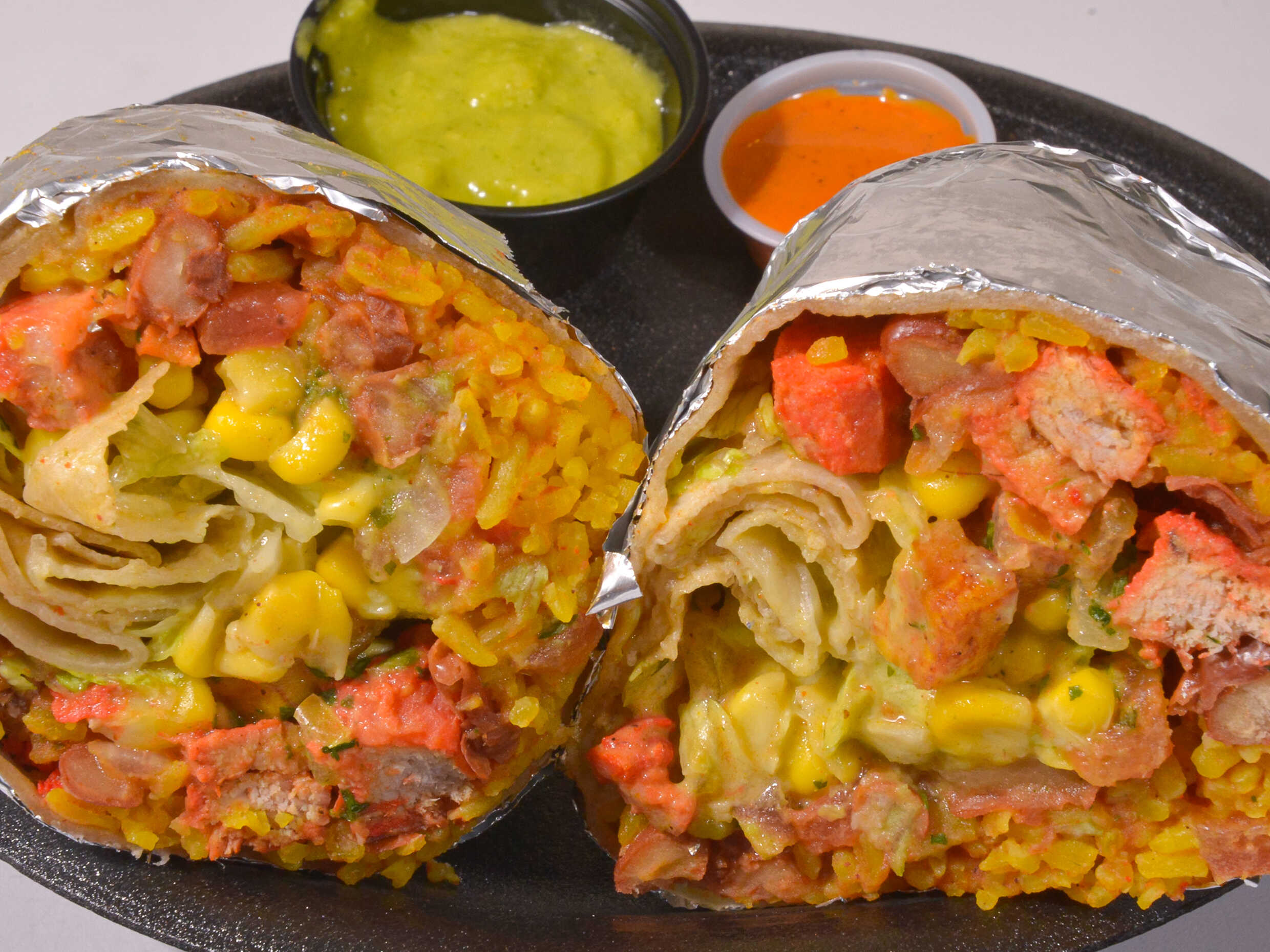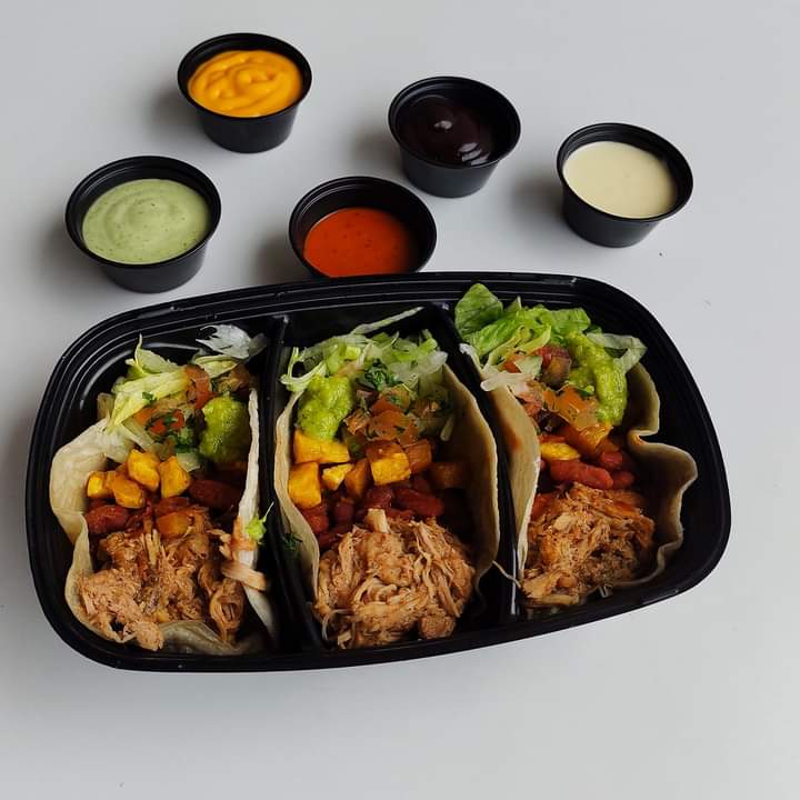 Tres tacos, arroz, frijol, carne, maduro, queso, pico de gallo, lechuga, maíz, guacamole y una salsa.
