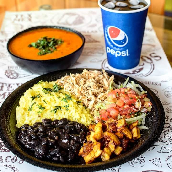 Arroz, frijol, pico de gallo, lechuga, maduro y bebida 12 onzas.