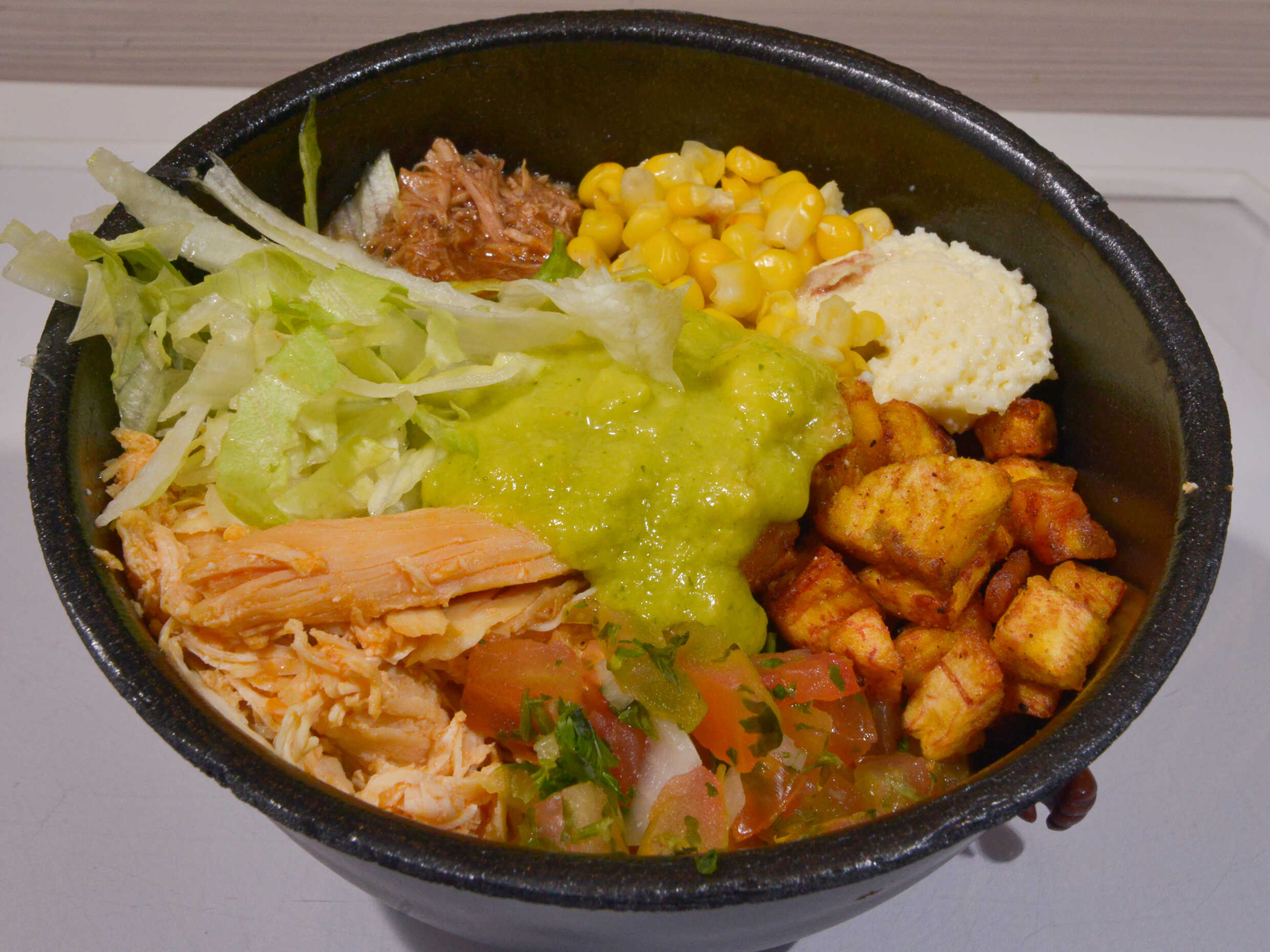 Carne, guacamole, pico de gallo, queso mozzarella, maíz, jalapeño y una salsa.