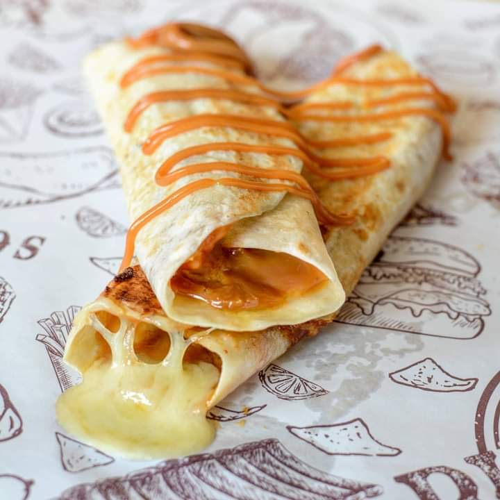 Tortilla enrollada con queso y arequipe.