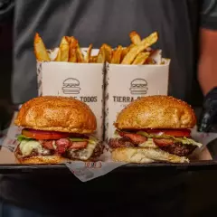 Hamburguesa de 200 g de carne 100 % angus certificada, con lechuga, tomate, cebolla, papas TDT y salsa de la casa (receta secreta) Papas TDT..