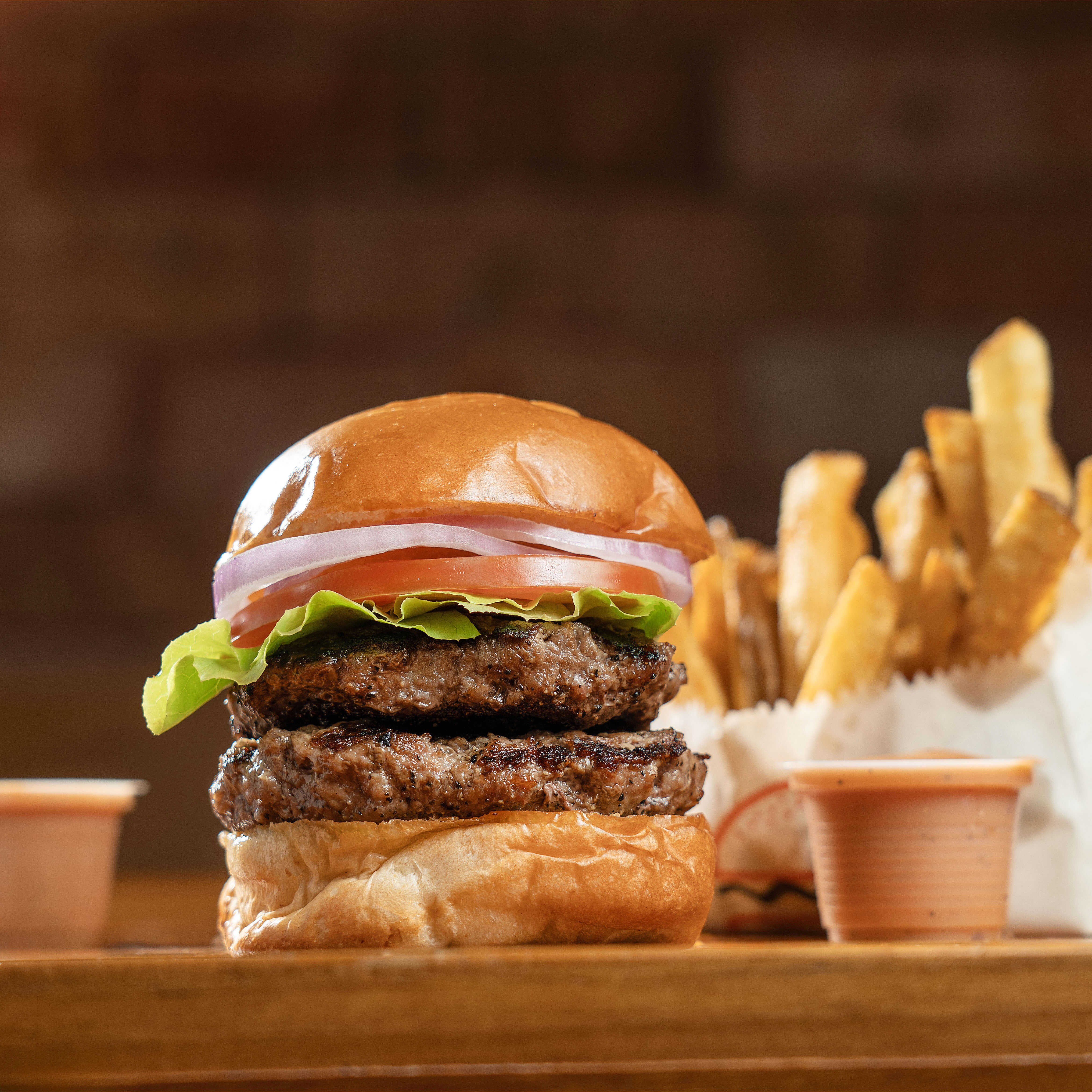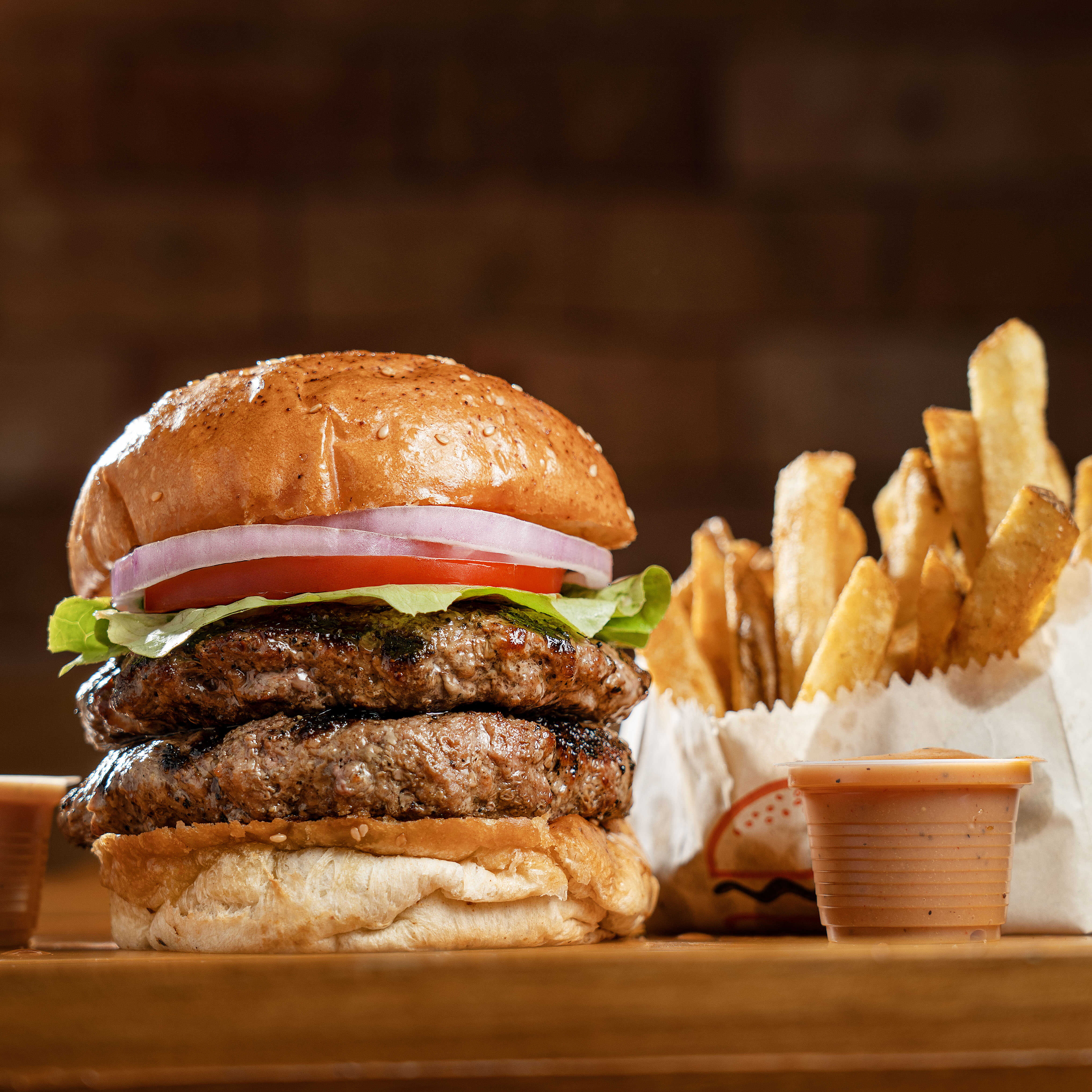 Hamburguesa de 400 g de carne 100 % angus certificada, con lechuga, tomate, cebolla, salsa de la casa (receta secreta) + Papas TDT.