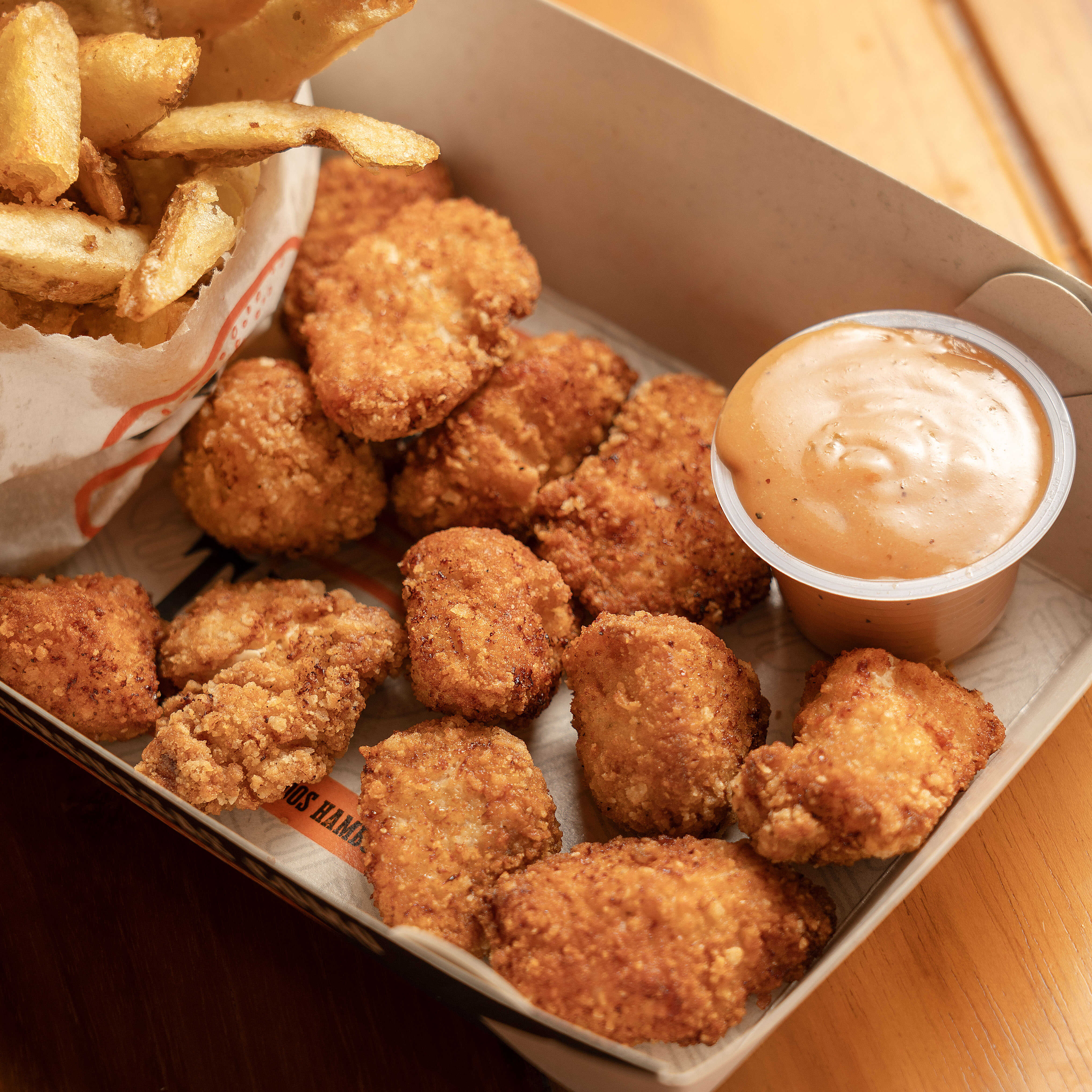 12 Nuggets por 240 g de pechuga 100 % pollo acompañado de papas y salsa de la casa (receta secreta).