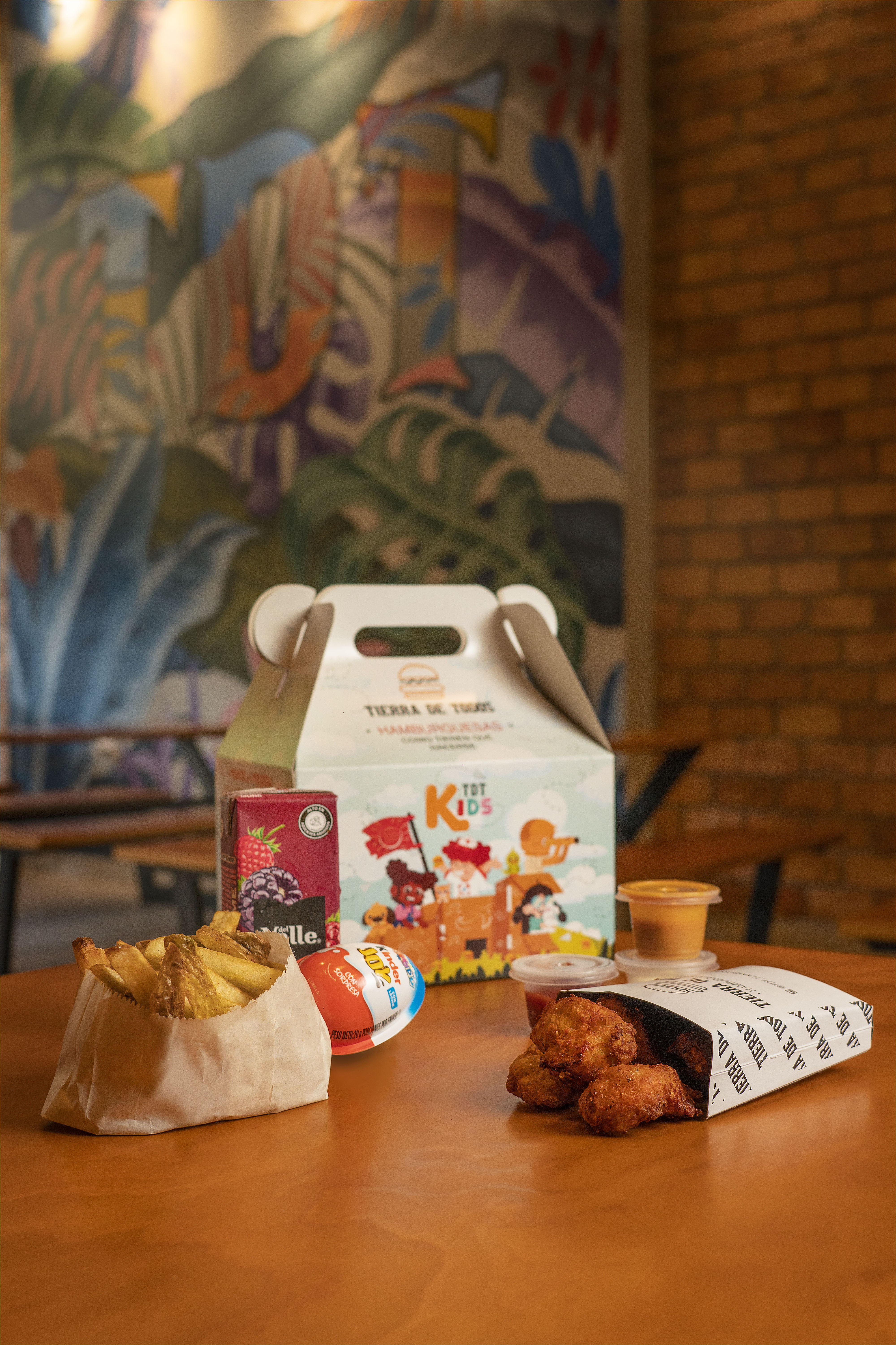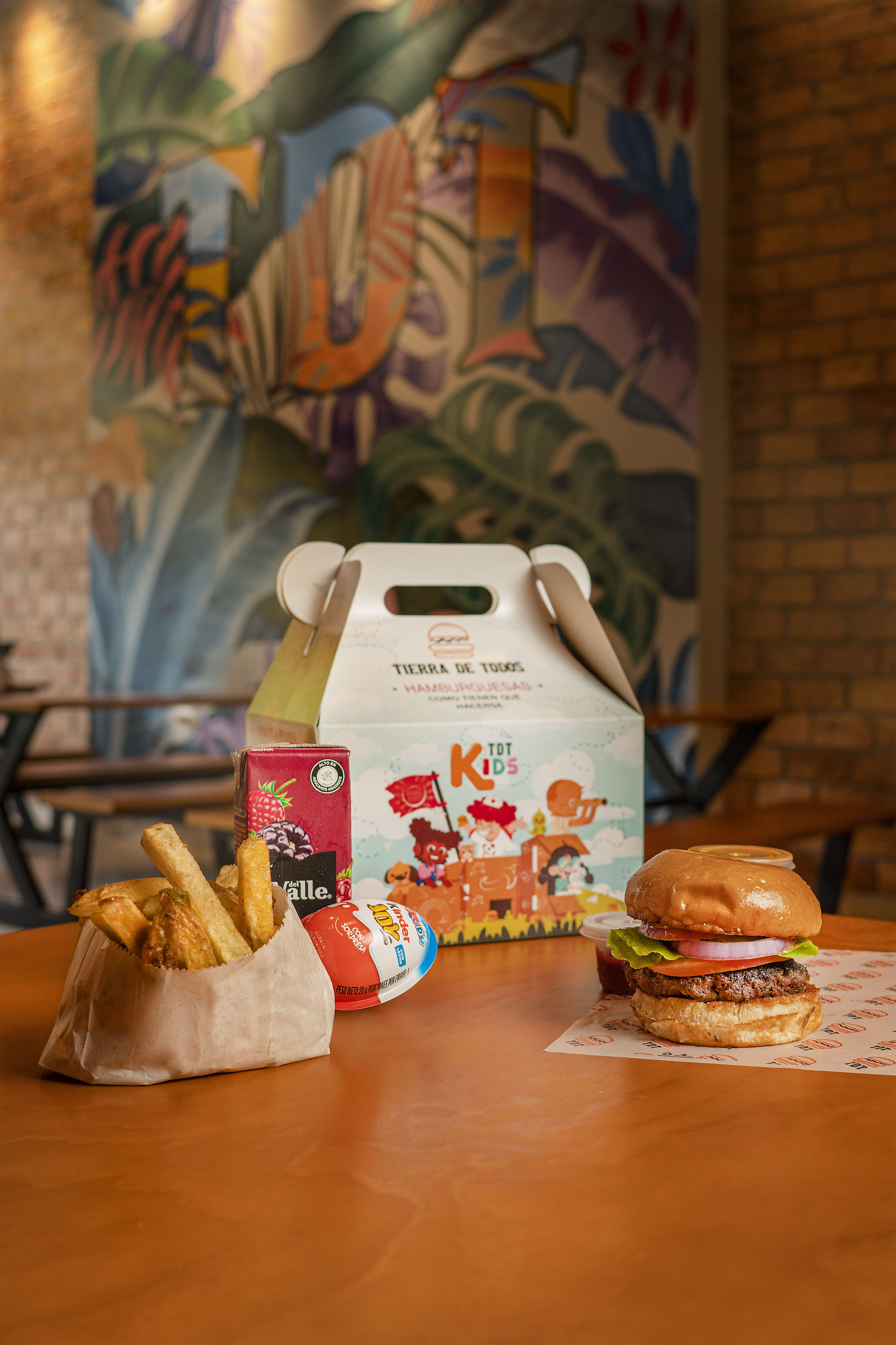 Hamburguesa TDT ligera, papas TDT, jugo de cajita del valle, postre y juguete sorpresa.