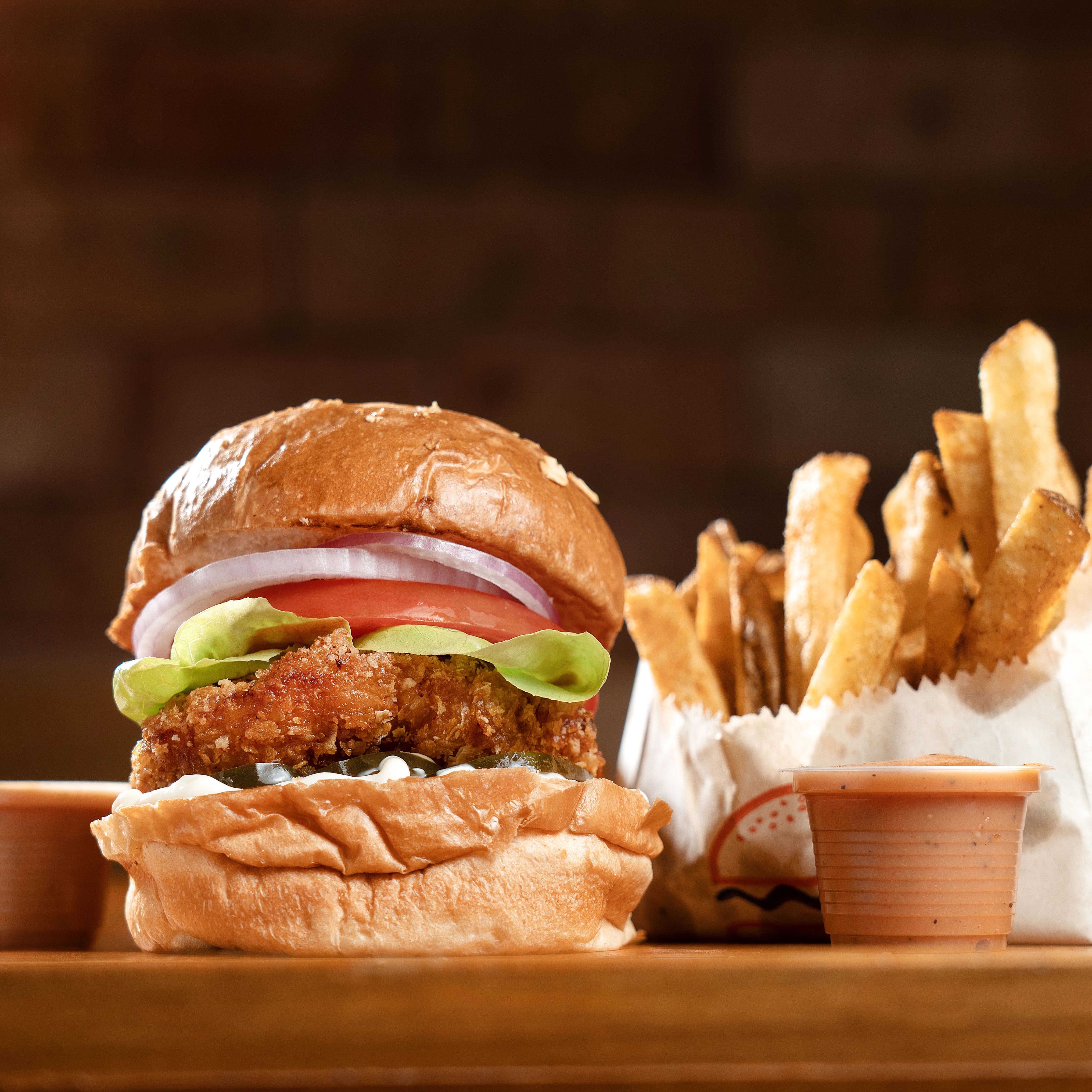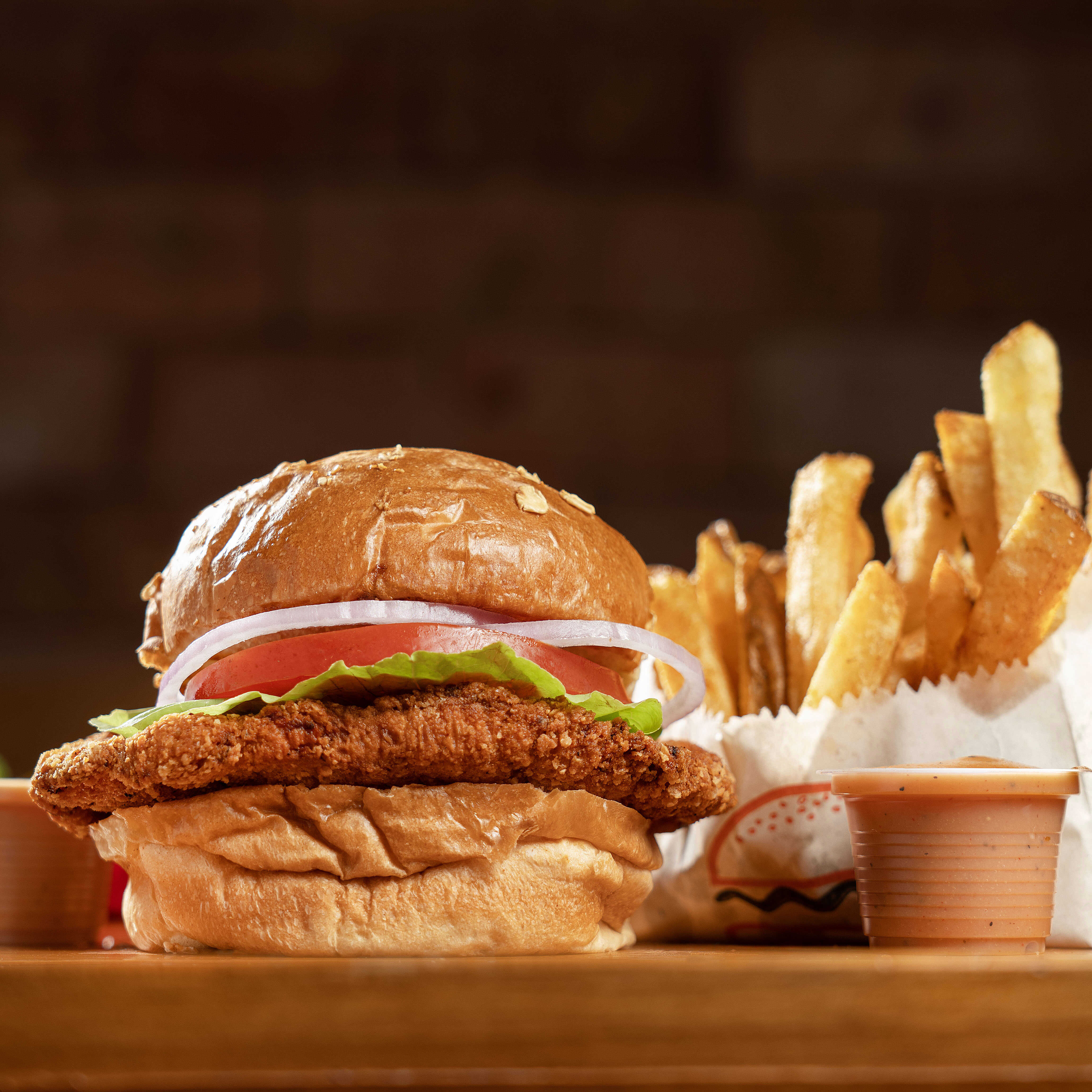 Hamburguesa de 175 g de pechuga de pollo, con lechuga, tomate, cebolla, salsa de la casa + Papas TDT.